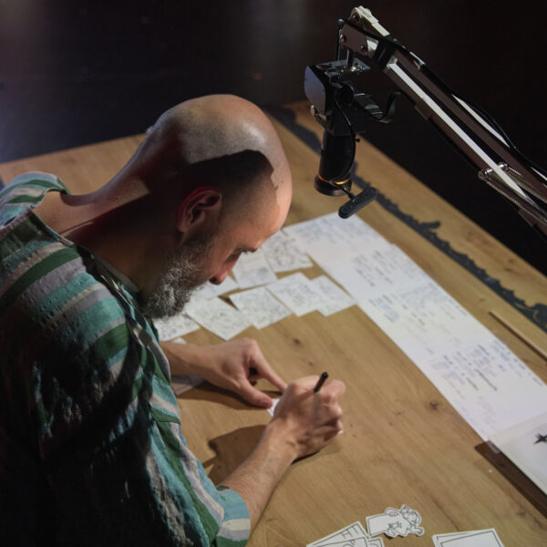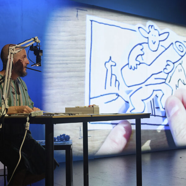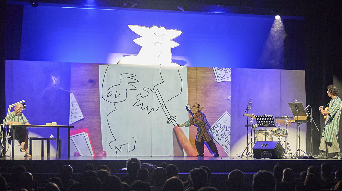 - Álvaro Ortiz convierte el escenario en un lienzo dinámico, dibujando y manipulando en directo personajes y escenas que cobran vida para el asombro del patio de butacas.